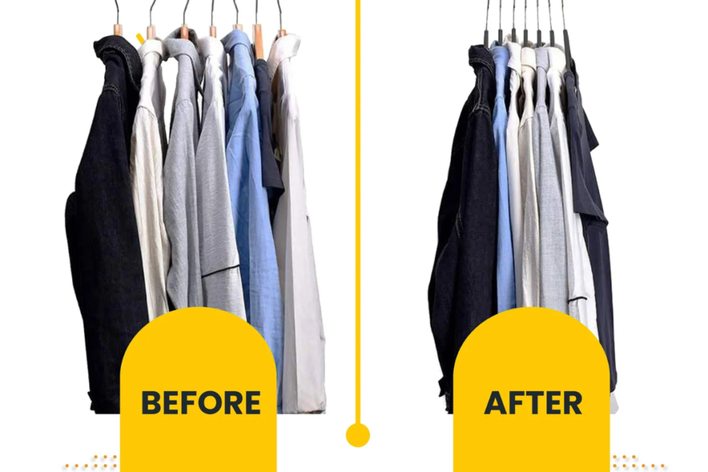 - Slim Hangers: Swap bulky plastic hangers for velvet “slim” hangers. They take up half the space and prevent clothes from sliding off.
