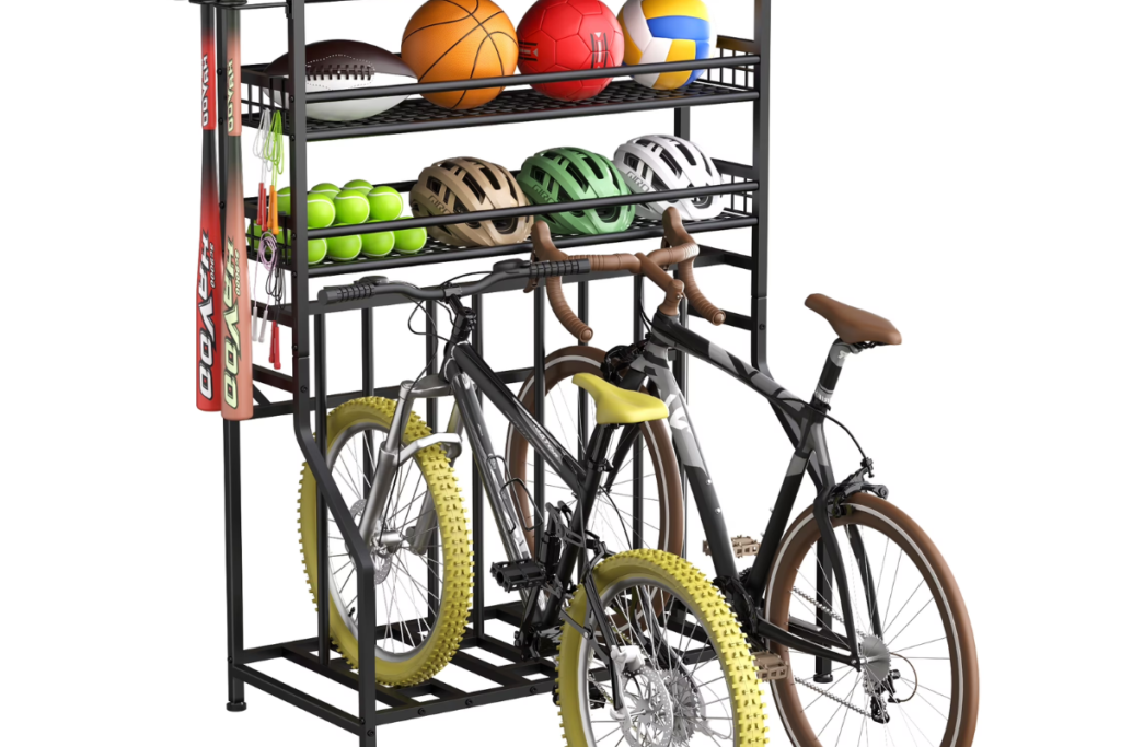 - Wall-mounted hooks for tools and bikes