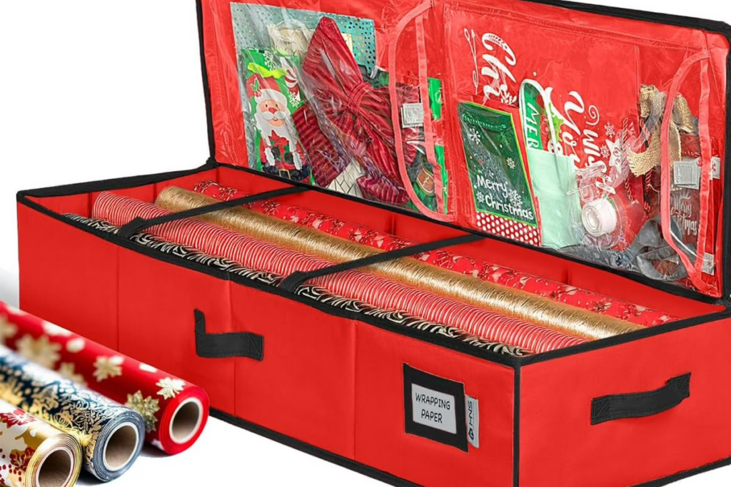 It’s long enough for those jumbo rolls and usually has little pockets for your tape, scissors, and ribbons. Slide it under the guest bed, and it’s out of sight until the next birthday or holiday rolls around.