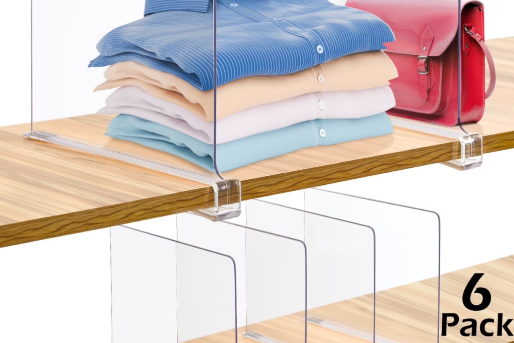To solve this, you can use Mainstays Clear Shelf Dividers. These simple acrylic tools clip onto your existing shelves to create designated sections, keeping your folded stacks upright and neat.