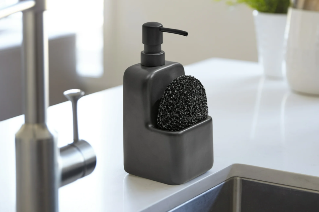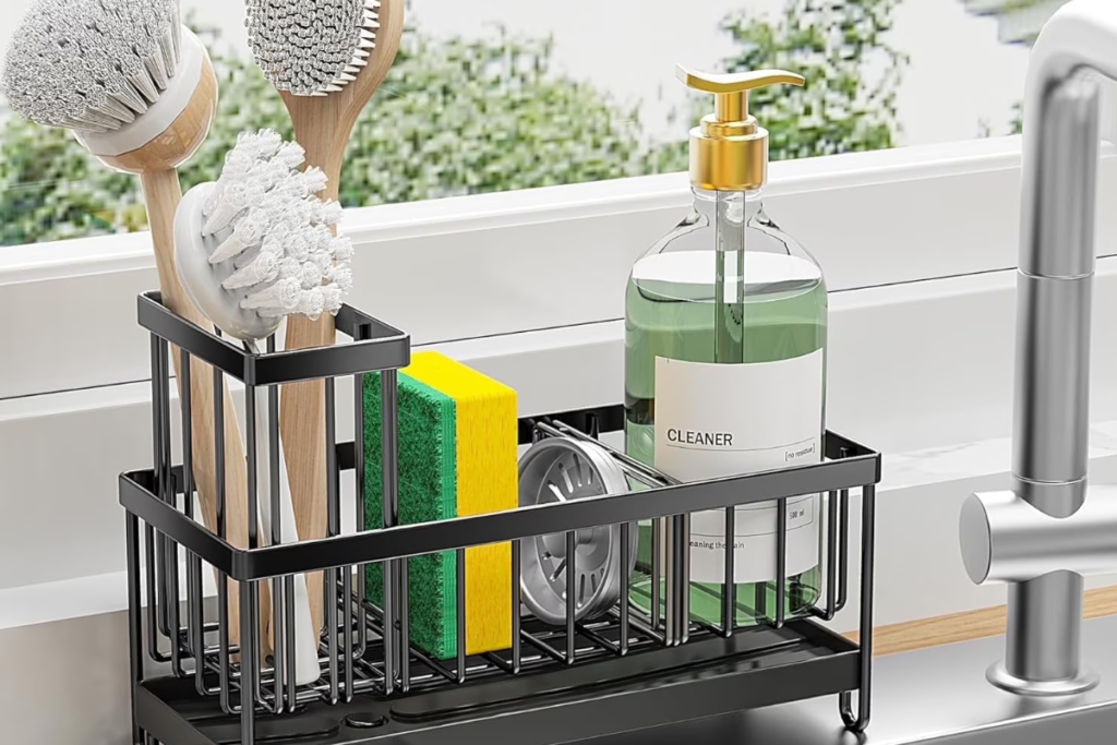 - If you have a small kitchen with limited counter space, go vertical. A wire caddy that sticks to the inside wall of your sink allows your sponge and brush to drip dry directly into the drain, preventing that dreaded “sour sponge” smell.