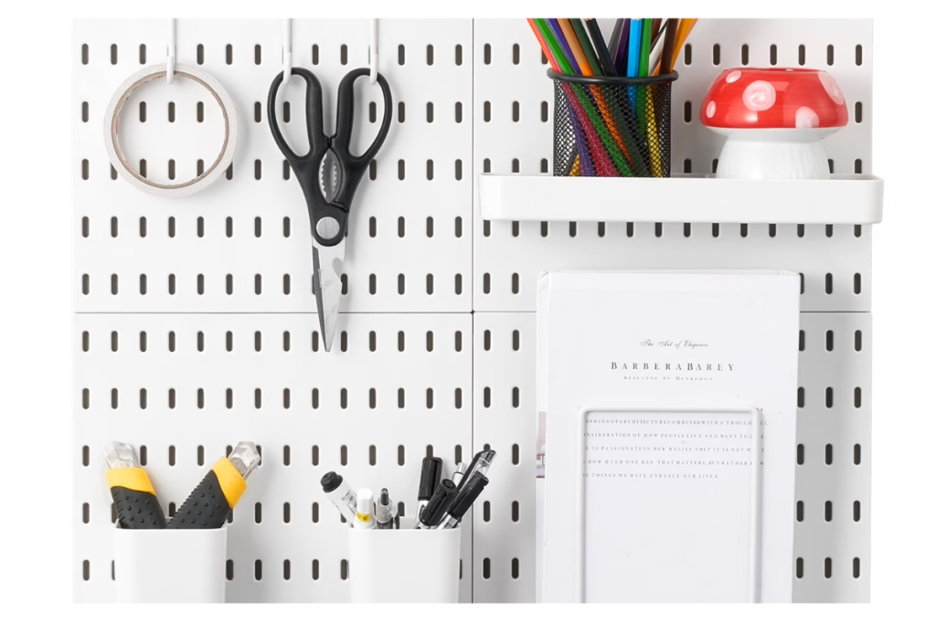 This keeps your workspace clear while ensuring your most-used items are always within sight. You can customize these boards with small baskets and hooks, making them as aesthetic as they are functional.
